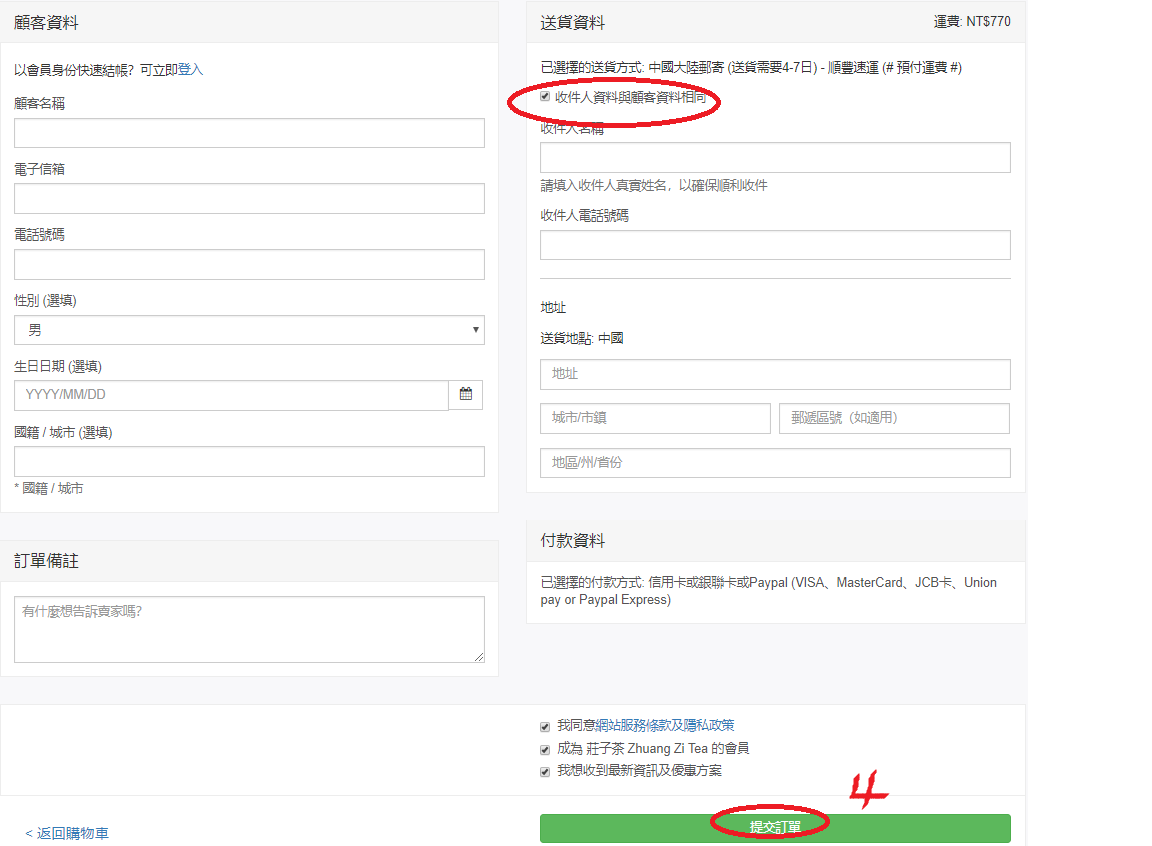 4.按下前往结帐,并填妥资料后,选择提交订单。