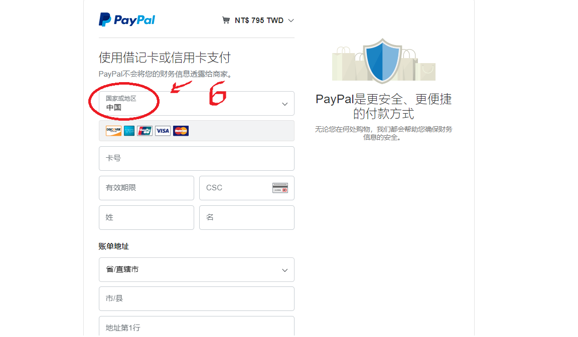 6.选择“中国”后,填写信用卡资料,填写完成!