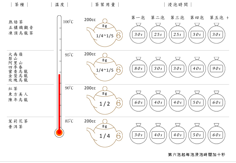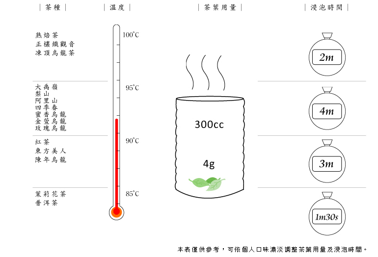 以1:100的比例放入茶葉,例如600cc的寶特瓶放入6公克的茶葉。也可依個人喜好斟酌茶葉量,多則濃少則淡。 |
